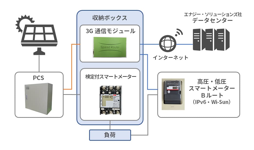 ソーラーモニターOff-Gridのシステム構成イメージ。太陽光発電用パワーコンディショナー(PCS:Power Conditioning System)に加え、電力会社の低圧・高圧スマートメーターBルートからのデータ取得が必要となり、今回新たに開発したソフトウェアを3G通信モジュールに搭載した
