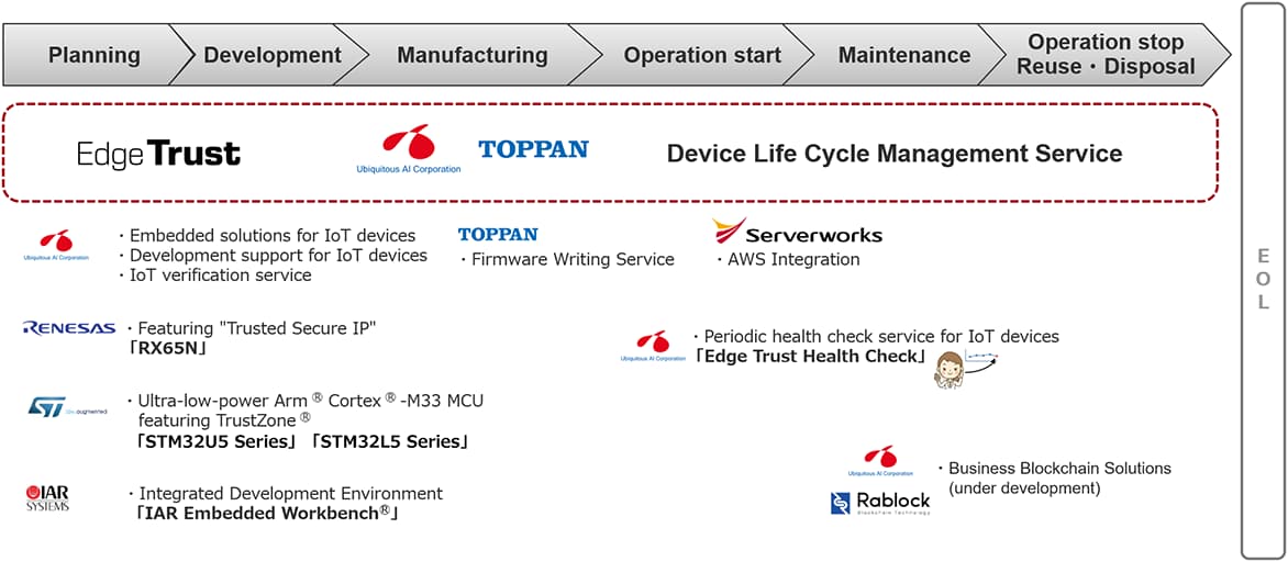 Based on the Edge Trust lifecycle management service of Toppan Printing and our company, we will provide solutions to solve various issues that arise in the development of IoT services through partnerships with a wide range of companies.