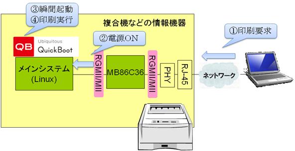 当社の 「QuickBoot」 と富士通セミコンダクター社が開発したネットワーク待機応答LSI 「MB86C36」 を組合せることにより、複合機や情報機器などの心臓部にあたるメインシステムの電力を完全に停止した状態から、ネットワークからの要求でメインシステムの電源を瞬間的に起動することができます。メインシステムの電源オンの時間を最小化することで、情報機器の消費電力を大幅に削減するとともに、ユーザーのネットワーク経由の要求に対して迅速に対応できる利便性も両立した情報機器の開発に大きく貢献します。